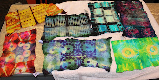 This is the general set up for a Gelatin mono- Printing class. each student is given their own gelatin plate- in this case it was an old lunch room tray filled with a slab of Knox gelatin made at a ratio of 8 envelopes of gelatin to 4 cup of water.